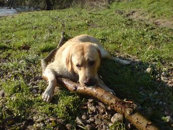 Keywords: Paddy - Labrador Retriever.JPG en A wet Labrador Retriever lying down chewing a stick near a river own Jayjimmyjames 2009-06-14 Yellow Labrador Retrievers Dogs on grass Wet dogs