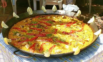 Keywords: Paella from Altea.jpg en Paella from Altea in the Land of Valencia sv Paella Spain Anette B 2002-06 Valencian paella Altea Lemon as garnish Paella pans Paella in Spain 2002 in the Land of Valencia