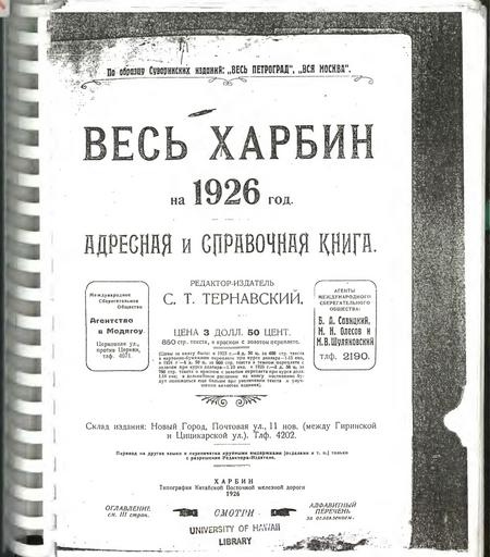 Keywords: харбин справочная книжка справочнаякнижка адресная книга адреснаякнига 1926 text outdoor Весь Харбин на 1926 год [Текст] : адресная и справочная книга / ред.-изд. С. Т. Тернавский. - Харбин : тип. Китайской восточной ж. д, 1926. - 28 см. Ксерокоп. (библ.описание по каталогу РГБ) Источник: rucont.ru/efd/299629 Весь Харбин на 1926 год [Текст] : адресная и справочная книга / ред.-изд. С. Т. Тернавский. - Харбин : тип. Китайской восточной ж. д, 1926. - 28 см. Ксерокоп. (библ.описание по каталогу РГБ) Источник: rucont.ru/efd/299629