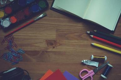 Keywords: paint notebook brush pencil foam paper painting wooden background headphones earphones drawing book pen education academic happy workspace workplace table