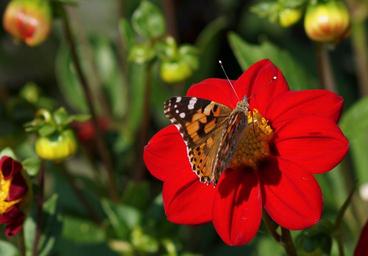 Keywords: painted lady dahlia red flowers flower garden garden plant flower garden plant dahlia garden late summer nature red flower butterfly nectar fly animal wing insect close macro