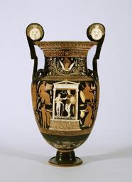 | Keywords: Painter of Copenhagen 4223 - Red-Figure Volute Krater - Walters 482759 - Side A.jpg The central scene depicts the deceased as a warrior in a naiskos small temple with a young servant by his side Male and female figures on either side of the temple carry various items like wreaths vases and dishes with branches or food as offerings for the deceased The opposite side shows a similar scene with four offering bearers but the temple is replaced by a grave stele Like the large volute krater by the Baltimore Painter 48 86 this vase is typical of the ornate style of Apulian vase painting- with multi-figured funerary scenes and intricate decoration This krater has been attributed to a well-known painter named after a vase in Copenhagen inv no 4223 mid 4th century BC Classical terracotta cm 78 11 45 09 accession number 48 2759 24434 Marilyn and Herbert Scher Pikesville MD 1983 by purchase Walters Art Museum Gift of Marilyn and Herbert Scher 2003 place of origin Apulia Italy Walters Art Museum license Ancient Greek red-figure pottery in the Walters Art Museum Painter of Copenhagen 4223 Media contributed by the Walters Art Museum needs category review Naiskos vases Volute kraters |