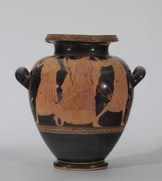 | Keywords: Painter of the Florence Stamnoi - Red-figure Stamnos with Eos and Two Youths - Walters 482034 - Side A.jpg His lyre tumbling to the ground the youth Cephalus flees the amorous goddess Eos She grabs his neck while fingering her mantle in the traditional gesture of a demure bride This theme was a popular subject for red-figure vessels from the early to mid 5th century BC This stamnos wine container belongs to a class of vessels which has a low foot in the form of a ring There are seven known stamnoi of this type All have the same size and proportions and were probably fashioned by the same potter between 470 460 BC Classical terracotta cm 36 3 19 3 accession number 48 2034 35108 Robert Garrett Collection date and mode of acquisition unknown Walters Art Museum 1951 by purchase Museum purchase 1951 Translation KALOS Pandora's Box Women in Classical Greece The Walters Art Gallery Baltimore; Dallas Museum of Art Dallas; Antikenmuseum Basel und Sammlung Ludwig Basel 1995-1996 Déjà Vu Recurrence The Walters Art Museum Baltimore 2007-2008 Heroes Mortals and Myths in Ancient Greece The Walters Art Museum Baltimore; Frist Center for the Visual Arts Nashville; San Diego Museum Of Art San Diego; Alexander S Onassis Public Benefit Foundation USA New York 2009-2011 place of origin Athens Greece Walters Art Museum license Ancient Greek red-figure pottery in the Walters Art Museum Painter of the Florence Stamnoi Media contributed by the Walters Art Museum needs category review Eos in ancient Greek pottery |