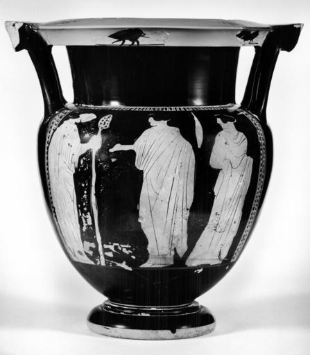 | Keywords: Painter of Munich 2335 - Column-Krater with a Komos and Three Maenads - Walters 4868 - Side B.jpg This red-figure column-krater depicts a komos On the front are three males and a woman On the left a bearded mantled man moves left looking at a skyphos less handles which he holds up in his right hand; a staff is in the left He wears a thick fillet in reserve around his head Part of the front of the figure and skyphos extend into and beyond the left border of the picture field The front of his right foot has been covered with glaze Behind him a youth with barbiton moves right He has a mantle draped over his left shoulder and a similar band around his head In his right hand he holds up a plectron In front of him a bearded mantled man moves right looking around He has a staff in his right hand and a band around his head On the far right is a woman wearing a chiton mantle necklace and fillet moving right and looking around She holds a pair of auloi in her left hand Her left foot overlaps the right border of the picture field The short cropped hair gives her an androgynous appearance suggesting that the painter might have been confused as to the sex of the figure On the back are three maenads On the left a woman in a chiton and mantle who holds a thyrsos in her right hand stands in profile to the right In the center another woman in a chiton and mantle stands to the left extending her right arm On the right a third woman in chiton and mantle moves left looking around A bag hangs between the last two figures On the rim are silhouettes of confronted lions and boars ca 440 430 BC Classical terracotta cm 35 9 27 h x max diam ; at mouth cm 28 2 diam ; at foot cm 14 1 diam accession number 48 68 38736 William T / Henry Walters Collection Baltimore date and mode of acquisition unknown Walters Art Museum Henry Walters Acquired by William T or Henry Walters Déjà Vu Recurrence The Walters Art Museum Baltimore 2007-2008 place of origin Attica Greece Walters Art Museum license Ancient Greek red-figure pottery in the Walters Art Museum Painter of Munich 2335 Media contributed by the Walters Art Museum needs category review Media contributed by the Walters Art Museum needs artist update Maenads in ancient Greek pottery |