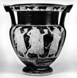 | Keywords: Painter of Syracuse 23510 - Column-Krater with Hermes and the Komos - Walters 4869 - Side B.jpg This red-figure column-krater depicts Hermes on the front He is pursuing a woman possibly Herse to the right He is bearded and dressed in a chlamys with a brooch and winged boots and has a petasos hanging down his back from his neck In his right hand he holds a kerykeion at waist level and he grasps her right arm with his left Dressed in a chiton mantle and sakkos she moves right looking around her left hand extended in front On the right stands a bearded elderly man possibly Kekrops wearing a chiton fillet and mantle He holds a scepter upright in his right hand and faces left On the far left a female companion possibly Aglauros flees left looking around She wears a chiton mantle and sakkos Her right hand protrudes from the drapery beneath her chin On the back is a komos On the left a mantled youth moves right a skyphos in his left hand In the center another youth moves right looking around He also holds out a skyphos in his left hand but he gestures with his right at his side On the right a third mantled youth stands to the left holding a staff diagonally across his body His left hand is covered with his mantle and he gestures with his raised right hand The first two wear fillets the paint used to indicate them now mostly lost On the rim in silhouette are three pairs of confronted lions and boars Hermes pursuing a woman is found on a number of early classical and classical red-figure vases but none has an inscription naming the woman; thus her identity is uncertain Most likely the woman he pursues on these vases is one of the Aglaurids possibly Herse while the king must be Kekrops and the other woman one of her sisters Aglauros or Pandrosos ca 460 BC Classical terracotta cm 43 6 35 3 h x max diam ; at mouth cm 36 9 diam ; at foot cm 1737 diam accession number 48 69 9351 Don Marcello Massarenti Collection Rome date and mode of acquisition unknown cat no 191 Henry Walters city Baltimore Walters Art Museum Henry Walters Acquired by Henry Walters with the Massarenti Collection 1902 place of origin Attica Greece Walters Art Museum license Ancient Greek red-figure pottery in the Walters Art Museum Painter of Syracuse 23510 Media contributed by the Walters Art Museum needs category review Media contributed by the Walters Art Museum needs artist update Komos scenes |