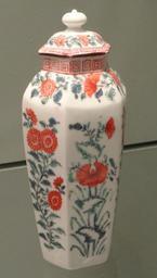 | Keywords: Pair of Hexagonal Vases, one of the pair, c. 1752-1755, Chelsea, soft-paste porcelain with overglaze enamels - Gardiner Museum, Toronto - DSC00615.JPG Exhibit in the Gardiner Museum Toronto Ontario Canada This artwork is in the public domain because the artist died more than 70 years ago Photography was permitted in the museum without restriction Daderot 2012-10-16 14 41 16 Daderot cc0 cc0 Chelsea porcelain in the Gardiner Museum Hexagonal vessels jars | ||||
