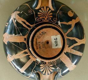 | Keywords: Palaestra scenes Louvre G384.jpg Painter of London E 80 Palaestra scenes javelin throw and boxing Attic red-figure cup ca 470 BC Found in Vulci Scènes de palestre lancer du javelot et pugilat Coupe attique à figures rouges vers 470 av J -C Provenance Vulci H 8 2 cm 3 in 23 1 cm 9 in W 30 cm 11 ¾ in Museum Louvre Department of Greek Etruscan and Roman Antiquities Sully first floor room 39 case 9 object history credit line Paravey Collection; purchase 1879 accession number G 384 Jastrow 2007 other versions <gallery> Image Javelin thrower Louvre G384 jpg Detail javelin thrower Image Boxing scene Louvre G384 jpg Detail boxing scene </gallery> Ancient Greek pottery from Vulci Ancient sports Painter of London E 80 Paravey Collection Greek antiquities in the Louvre - Room 39 Kylixes Athletes in ancient Greek pottery 470s BC pottery in France Paris |
