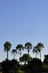 Keywords: palm trees sky horizon water zambezi birds flock of birds blue river island