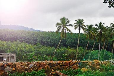 Keywords: palm trees wall jungle tropical vegetation hut shed trees forest green lush vibrant