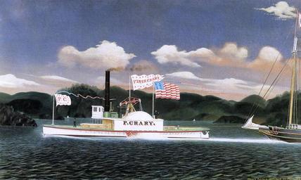 | Keywords: Palmer Crary (steam towboat) 02.jpg en Palmer Crary also known as P Crary New York harbor and Hudson River steam towboat built 1852 Oil on canvas by James Bard One of two similar but non-identical works showing the P Crary towing the becalmed sloop Turkey Glen http //www the-athenaeum org/ The Athenaeum org Creator James Bard 1858 PD-old-100 Original was in a private collection as of 1997 Reproduced in Mariner's Museum and Peluso Anthony J Jr The Bard Brothers -- Painting America under Steam and Sail Abrams New York 1997 ISBN 0-8109-1240-6 In particular this book reproduces larger images of the background vessels Peter G Coffin and Isaac P Smith PD-old-100 James Bard 1851-1860 works Palmer Crary tugboat 1852 Images from the-athenaeum org |