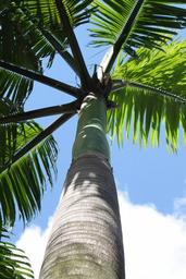 Keywords: palms trees tropical hawaiian flora looking up above woods woody wooden trunks green leaves leafy tall blue sky bright sunny day outdoors gardens coconut trees scenic scenery plants
