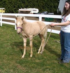 | Keywords: horses palomino colt outdoor animal In this picture the colt, named Bear, is about two months old. He is accompanied by a stablehand holding his lead. CC0 waiver: To the extent possible under law, I waive all copyright and related or neighboring rights to this work. In this picture the colt, named Bear, is about two months old. He is accompanied by a stablehand holding his lead. CC0 waiver: To the extent possible under law, I waive all copyright and related or neighboring rights to this work. |