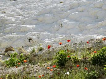 Keywords: pamukkale turkey lime sinter terrace limestone mineral white world heritage poppy flowers red summer lizard