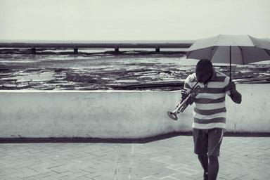 Keywords: panama guy man people trumpet musician music umbrella shorts ocean sea water black and white