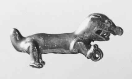 | Keywords: Panamanian - Crocodile Pendant - Walters 57302 - Group.jpg Pendants were worn by men around the neck on ceremonial occasions Columbus noted that the inhabitants of Panama who came to greet him wore gold pendants This piece could have been created in Columbus's time or during the previous 600 years The animals represented are often fierce ones with which a warrior would have wanted to associate Two animals are frequently combined creating a mythic creature with composite attributes This crocodile-like pendant has either a double-tongue or more likely a double-headed snake in its mouth The tail is divided in two parts The heads of the snake as well as the claws of the feet are formed of spiral-like attachments The loops for suspension are under the forefeet between 800 1521 Pre-Early Conquest gold and copper alloy cm 6 03 accession number 57 302 36123 Henry Walters Baltimore 1911 mode of acquisition unknown Walters Art Museum Henry Walters Acquired by Henry Walters 1911 place of origin Veraguas-Gran Chiriquà in present-day Panama Walters Art Museum license Pre-Columbian art in the Walters Art Museum Pre-Columbian metalwork of Panama Media contributed by the Walters Art Museum needs category review |