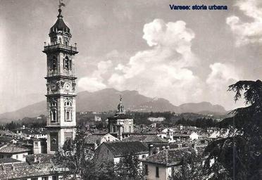 | Keywords: Vista sul centro e colli nella prima metà degli anni '30. In piazza San Vittore non è ancora stato edificato il palazzo della Cariplo (ing. Angiolini, 1937). Sul retrostante colle Miogni sono perfettamente visibili le ville Mylius (a destra) e Carmen Sylva (a sinistra). A destra, seminascosto dagli alberi, l'edificio multipiano era l'antico palazzo arcivescovile (citato per la prima volta nel 1179) costruito dietro il battistero di San Giovanni Battista, abbattuto negli anni '60 per realizzare la sede di un istituto bancario (la ex Banca Popolare di Luino e di Varese). varese |