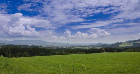 Keywords: panorama austria mountains country green grass blue sky clouds summer