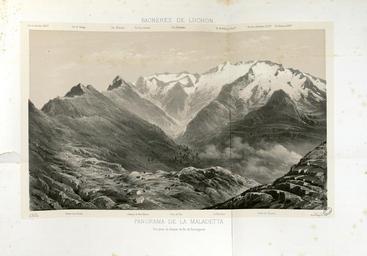 | Keywords: Panorama de la Maladetta - Vue prise du Sentier du Pic de Sauvegarde - Fonds Ancely - B315556101 A PETIT 3 017.jpg Fait partie d'un recueil de deux albums Bagnères de Luchon et ses environs; Souvenirs des Pyrénées composés d'une page de titre lithographiée et de lithographies Vignettes aux titres Hospice de Luchon Haute-Vallée de la Pique en couleurs et Pont Napoléon à Saint-Sauveur Dulon publie à plusieurs reprises après Souvenirs des Pyrénées album de 30 pl cf A-PETIT 1 des recueils de vues de Luchon et autres sites des Pyrénées par Victor Petit dont la composition est très variable Les planches ne sont plus tirées chez Thierry mais par l'imprimerie J Monrocq à Paris Sous des reliures pleine toile éditeur très ornées et enrichies de fermoirs métalliques frappées du titre Souvenirs des Pyrénées par Victor Petit Dulon mettra en vente des recueils où les planches de Victor Petit voisinent avec celles de Mercereau tirées de La France de nos jours et celles en couleurs de Ch Maurice Ancely René 1876 - 1966 Possesseur fre public domain domaine public B315556101_A_PETIT_3_017 jpg image/jpeg 1 f de pl dépl lithogr ; 42 5 cm oblong Dulon Éditeur Monrocq Imprimeur http //numerique bibliotheque toulouse fr/collect/general/index/assoc//ark /74899/B315556101_A_PETIT_3_017 dir/B315556101_A_PETIT_3_017 jpg Bibliothèque municipale de Toulouse A-PETIT 3-1-16 Creator Victor Jean-Baptiste Petit http //catalogues toulouse fr/web2/tramp2 exe/do_keyword_search/log_in setting_key BMT1 servers 1home query p002000 vignette http //numerique bibliotheque toulouse fr/collect/general/index/assoc//ark /74899/B315556101_A_PETIT_3_017 dir/B315556101_A_PETIT_3_017_thumb jpeg century 19 Panorama de la Maladetta - Vue prise du Sentier du Pic de Sauvegarde B315556101_A_PETIT_3_017 lithography - print Maladeta Victor Jean-Baptiste Petit History of Pyrénées Bagnères-de-Luchon in art Mountains in art Aneto 19th-century art |
