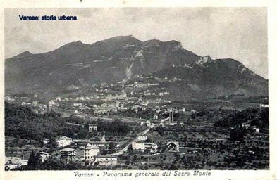 | Keywords: Immagine ripresa da Biumo Superiore. Al centro viale Aguggiari che corre rettilineo tra campi e coltivazioni. Le due alte ciminiere appartengono l'officina del tram (attualmente occupato da un ristorante). In basso a sinistra il gruppo di cascine tutt'ora esistenti e raggiungibili da via Carantani. varese |