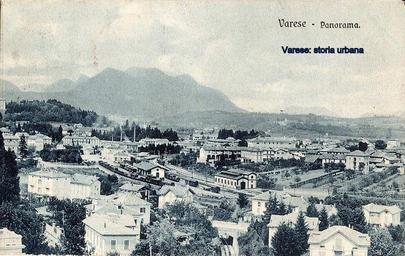 | Keywords: Immagine ripresa da Bosto. Al centro la stazione delle Ferrovie dello Stato (1865): il piazzale è ancora un terrapieno alberato. Sul fondo gli stabilimenti del Calzaturificio di Varese e dei Molini Marzoli Massari con alte ciminiere. A destra la collina di Giubiano con l'ospedale Del Ponte. varese |
