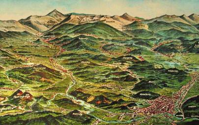 Keywords: Panorama Kotlina Karkonosze 02.jpg Kotlina Jeleniogórska Hirschberger Tal Karkonosze Mountains Riesengebirge around 1925 Panorama des Hirschberger Tals mit Riesengebirge im Vordergrund Hirschberg Kolorierte Zeichnung vor 1930 PD-Art Krkonoše Artworks missing infobox template