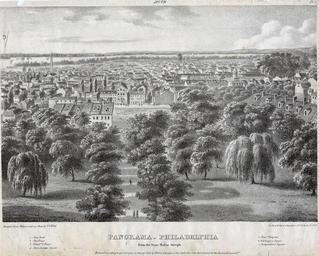| Keywords: library company of philadelphia librarycompanyofphiladelphia lithography (philadelphia, pa.) lithographyphiladelphiapa philadelphia on stone philadelphiaonstone wild, j. c. (john caspar), ca. 1804-1846 wildjcjohncasparca18041846 moyamensing prison (philadelphia, pa.) moyamensingprisonphiladelphiapa pennsylvania hospital (philadelphia, pa.) pennsylvaniahospitalphiladelphiapa philadelphia naval shipyard (philadelphia, pa.) philadelphianavalshipyardphiladelphiapa delaware river delawareriver outdoor Panoramic view looking south toward the Delaware River predominately showing the area between Independence Square, the river, and about 8th Street. Includes the Navy Yard at Southwark (1); Shot Tower, 2nd and Carpenter streets (2); Philadepha. C. Prison, i.e., Moyamensing Prison, 1000 block of Reed Street; Albert Barnes Church, i.e., First Presbyterian Church, 626-630 Locust Street (4); Penna. Hospital, 801-849 Pine Street (5); Washington Square, between Sixth, Eighth, Walnut and Spruce streets (6); and Independence Square (7). Also shows visitors on the grounds of Independence Square, the 500 block of the south side of Walnut Street, including a horse-drawn dray, and the rooftops of several city blocks. Panoramic view looking south toward the Delaware River predominately showing the area between Independence Square, the river, and about 8th Street. Includes the Navy Yard at Southwark (1); Shot Tower, 2nd and Carpenter streets (2); Philadepha. C. Prison, i.e., Moyamensing Prison, 1000 block of Reed Street; Albert Barnes Church, i.e., First Presbyterian Church, 626-630 Locust Street (4); Penna. Hospital, 801-849 Pine Street (5); Washington Square, between Sixth, Eighth, Walnut and Spruce streets (6); and Independence Square (7). Also shows visitors on the grounds of Independence Square, the 500 block of the south side of Walnut Street, including a horse-drawn dray, and the rooftops of several city blocks. |