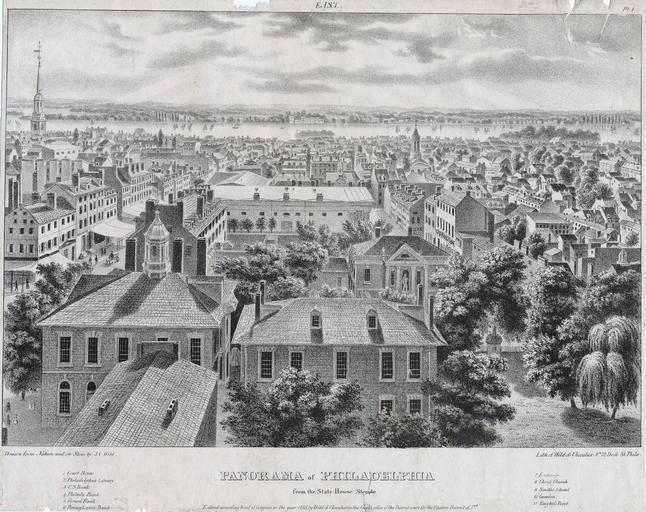 | Keywords: library company of philadelphia librarycompanyofphiladelphia lithography (philadelphia, pa.) lithographyphiladelphiapa philadelphia on stone philadelphiaonstone wild, j. c. (john caspar), ca. 1804-1846 wildjcjohncasparca18041846 city hall (philadelphia, pa.) cityhallphiladelphiapa delaware river delawareriver outdoor Panoramic view looking toward the Delaware River predominately showing the area east of Fifth Street between Arch and South streets. Includes the Court House, i.e. City Hall, 500 Chestnut Street (1); Philadelphia Library, i.e., Library Company of Philadelphia, 105 S. 5th Street (2); U.S. Bank, i.e., Second Bank of the U.S., 420 Chestnut Street (3); Philadelphia Bank, 400-408 Chestnut Street (4); Girard Bank, 120 S. 3rd Street (5); Pennsylvania Bank, 134-136 S. 2nd Street (6); [Merchants’] Exchange, 143 S. 3rd Street (7) Christ Church, 22-34 N. 2nd Street (8); Smith’s Island, Delaware River (9); and Camden (10) and Kaighn’s Point (11) in New Jersey. Also shows part of the State House garden; the north side of the 400 block of Chestnut Street; the adjoined storefronts at 426-434 Chestnut Street; the "Our House" hotel, 408 Library Street; Military Hall, 412 Library Street; rooftop views of several of the surrounding city blocks; and a few pedestrians and a horse-drawn carriage on the 400 block of Chestnut Street and the grounds of the State House. Panoramic view looking toward the Delaware River predominately showing the area east of Fifth Street between Arch and South streets. Includes the Court House, i.e. City Hall, 500 Chestnut Street (1); Philadelphia Library, i.e., Library Company of Philadelphia, 105 S. 5th Street (2); U.S. Bank, i.e., Second Bank of the U.S., 420 Chestnut Street (3); Philadelphia Bank, 400-408 Chestnut Street (4); Girard Bank, 120 S. 3rd Street (5); Pennsylvania Bank, 134-136 S. 2nd Street (6); [Merchants’] Exchange, 143 S. 3rd Street (7) Christ Church, 22-34 N. 2nd Street (8); Smith’s Island, Delaware River (9); and Camden (10) and Kaighn’s Point (11) in New Jersey. Also shows part of the State House garden; the north side of the 400 block of Chestnut Street; the adjoined storefronts at 426-434 Chestnut Street; the "Our House" hotel, 408 Library Street; Military Hall, 412 Library Street; rooftop views of several of the surrounding city blocks; and a few pedestrians and a horse-drawn carriage on the 400 block of Chestnut Street and the grounds of the State House. |