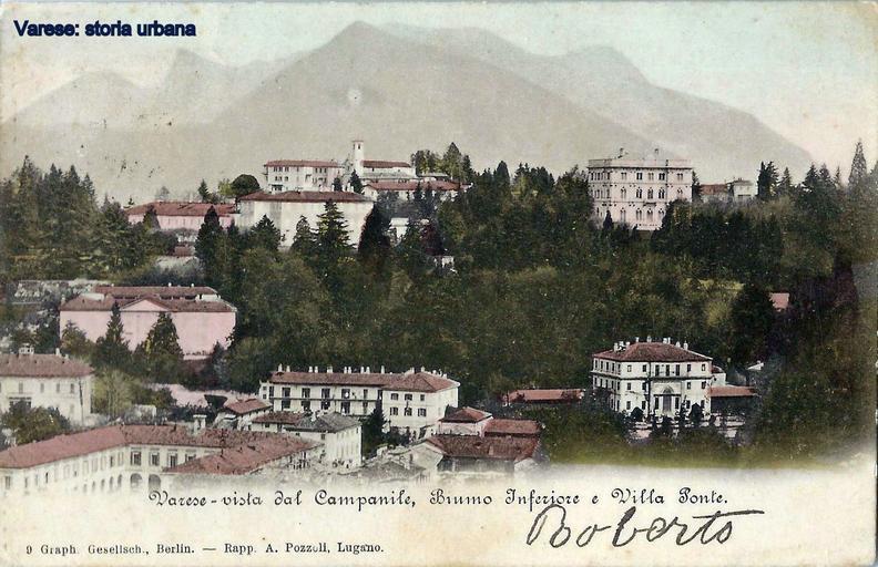 | Keywords: Versione colorata. Vista su Biumo Superiore. In alto la chiesa di San Giorgio, sotto la quale si ergono le ville Panza-Litta-Menafoglio (a sinistra) e Ponti (a destra). Poco sotto villa Panza, all'estrema sinistra villa San Francesco con timpano triangolare. Più in basso l'edificio ad u con al centro la torretta con campana ospitava le scuole civiche (sostituite dal palazzo del tribunale) e davanti al quale era posta la statua dedicata ai Cacciatori delle Alpi (spostata nel 1901 in piazza Podestà ). A destra sorge isolata villa Dandolo (ora Selene). varese |