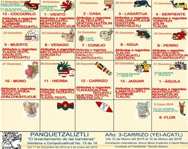 | Keywords: text screenshot XIUHPOHUALLI: CE-CUAUHTLI (1-ÁGUILA) 31/Dic/2015 - Glifo, símbolo o signo (No. 15 de 20): CUAUHTLI (ÁGUILA) [15o. día de la veintena] - Numeral 1 de 13): &quot;CE&quot; [la cuenta de la trecena indica el numeral] [no confundir con la numeración de la fecha gregoriana europea, es decir con el día] Atributos: [Señor diurno y ave llevan el mismo numero de la trecena] - Regente diurno (No. 1 de 13): XIUHTECUHTLI (El señor del fuego) - Ave compañera (No. 1 de 13): NEXHUITZILIN (Colibrí gris) - Regente de la noche (No. 1 de 9): XIUHTECUHTLI (señor del fuego) - Trecena (19 de 20): CE-CUAUHTLI (1-ÁGUILA) [31 Diciembre 2015 al 12 Enero 2016] - Veintena (15 de 18): PANQUETZALIZTLI &quot;El levantamiento de las banderas (estandartes)&quot; [Del 17 de Diciembre del 2015 al 5 de Enero del 2016] - Tlalpilli (4 de 4): CALLI [Hay 4 cargadores de años: TOCHTLI, ACATL, TECPATL, CALLI] - Año Mexhika (42 de 52): YEI-ACATL (3-CARRIZO) [12/Marzo/2015 a 11/Marzo/2016] - Xiuhmohpilli (ciclo o Atado de 52 años): En Marzo del año 2026 será el próximo encendido del FUEGO NUEVO en el cerro Huizachtepetl en Ixtapalapan [Xiuhpohualli es un calendario solar, es la cuenta astronómica o cuenta de las veintenas] ********************************************* * DESCRIPCIÓN DE LA VEINTENA * ********************************************* Veintena: PANQUEZALIZTLI &quot;El levantamiento de las banderas o estandartes&quot; 15a. Veintena del año Mexhica (equivalente al &quot;mes&quot; pero de 20 días) [Del 17 de Diciembre del 2015 al 5 de Enero del 2016] Fiesta dedicada a Huitzilopochtli la fuerza de Voluntad logradora. Es en esta veintena donde se festeja la transición al invierno, ya que las celebraciones comienzan desde 9 noches antes de la entrada del invierno, que correspondiente al 12 de Diciembre, después de esta fecha se realizan nueve noches con procesiones o marchas nocturnas que terminan aproximadamente por el día Coatl (21-22 de Diciembre); sin embargo los fríos invernales se presentan 13 días después de esa última fecha (5 de Enero). Se llama esta veintena “levantamiento de las banderas” ya que los campos de siembra mantenían esta forma rectangular que a lo lejos parecían una bandera, y en estos días ya se han levantado totalmente las cosechas, por lo que el nombre también refiere al “levantamiento total de las cosechas”. Es tiempo de dejar descansar la tierra y comenzar a adjudicar los campos entre aquellos calpulli que más trabajaron y se entregaba menos campo a los que menos trabajaron. En estos días se agradece a la naturaleza por todos los productos que ofrendó a lo largo del año, una costumbre es la de adornar árboles y arbustos existentes con papeles colgantes en sus ramas, antiguamente los adornos eran de papel amate en forma de banderas y de diferentes colores. Hoy en día venden algunos adornos en forma de espiral también. Las personas en esta veintena hacen cuenta de sus logros, aciertos, y evalúan las fallas por las cuales no hubo éxito en los planes y actividades. La fiesta principal es para celebrar el nacimiento del sol niño llamado Piltzintecuhtli “El pequeño guía”, se le llama así al sol del primer amanecer del invierno que es pequeño y muy brillante. Los 9 días posteriores al sol se le denomina Huitzilopochtli o fuerza de voluntad logradora ya que durante 9 días el sol deja de recorrerse en su andar entre el norte y el sur, dado esto se considera que el sol durante estos días tiene una gran fuerza de voluntad para tener este ciclo de inmovilidad por lo que la gente celebra ese vigor, lo toma como modelo y lo recibe para todo el año comenzando la primavera. Es durante esta veintena que Huitzilopochtli o fuerza de voluntad es festejada realizando diversas pruebas, competencias, ejercicios para la práctica de la fuerza de voluntad humana. Uno de los primeros ejercicios eran los de adaptación al frio, para los cuales las personas, debían de ir a los campos con pocas ropas para realizar caminatas, llevando antorchas y cantando alrededor de los campos de siembra. Se realizan carreras con pruebas de obstáculos a librar, encierros en cuevas, y otros ejercicios que implican el control mental que te lleva a un manejo de fuerza de voluntad interna. Antiguamente las personas que se preparaban para esta veintena lo hacían veinte días antes, durante estos días debían ir por ramas y enramar todos los altares y templos de los montes por más lejos que estuviesen, estas caminatas se hacían a la media noche y casi desnudos durante el camino iban tocando caracoles y flautas realizando cantos. Como se mencionó en la veintena pasada &quot;Quecholli&quot;. Durante todos los días de esta veintena realizaban la ceremonia llamada Tlaxotecayotl, que son cantos a Huitzilopochtli, comenzaban al atardecer y terminaban a la media noche, esto lo hacían tanto hombres como mujeres. Adornaban los arboles con tiras de papel, adornos de colores y sahumaban todos los arboles, preparaban un abono especial con comida y bebida para durante esta veintena ofrendarlo a los arboles y agradecer por sus frutos y la generación de oxigeno para nuestro consumo. A los 9 días de esta veintena se preparaban aquellos que se iban a ofrendar, se bañaban a los adeptos con agua de una fuente que se llamaba Huitzil-Atl que estaba en un pueblo llamado Huitzilopuchco (hoy mal llamado Churubusco). Las personas de mayor edad iban por esta agua y la traían en cantaros tapados con hojas de Ahuehuetl, de esta manera al llegar a donde están los estudiantes les echaban un cántaro de agua sobre la cabeza. Posteriormente se les quitaban las ropas húmedas y se les vestía con atuendos nuevos, se pintaban los brazos y las piernas con color azul claro dejando unas rayas sobre esta pintura, las caras se les pintan con bandas de color amarillo y azul atravesadas por todo el rostro. Ya atuendados se dirigían al patio de Huitzilopochtli y comenzaban una danza. A los