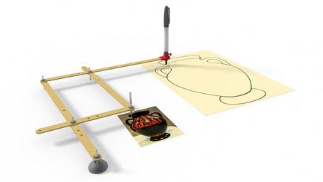 Keywords: Pantograph01.jpg en 3D rendering of pantograph tracing a photo of a vase Created by Joseph Lertola 1/13/2016 own Jlert~commonswiki 2016-01-13 Cc-zero Drawing tools 3D rendering Images created with LightWave 3D