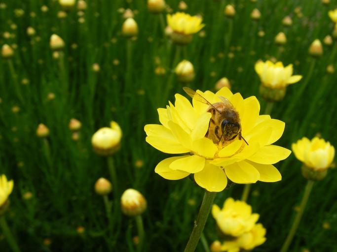 Keywords: paper daisy yellow daisy paper bee flowers spring pollen busy working honey honeybee