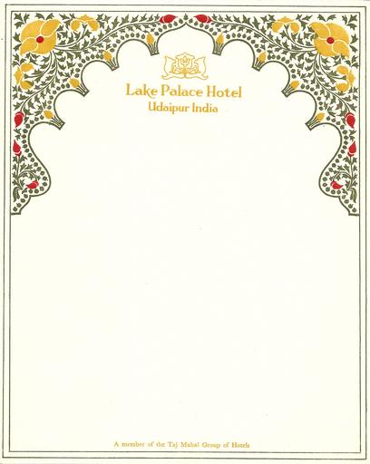 | Keywords: Paper sheet of Lake Palace Hotel.jpg en Paper sheet of Lake Palace Hotel Udaipur India 1976 fr Feuille de bloc de courrier du Lake Palace Hotel Udaipur Inde 1976 own scan 2016-12-19 Tangopaso Location not applicable Lake Palace Udaipur Paper sheets |