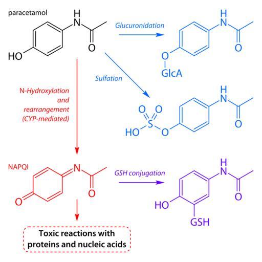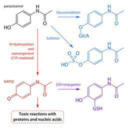 | Keywords: Paracetamol metabolism.svg validSVG Simplified schematic of the key pathways of w paracetamol metabolism in the human body The first step in conversion of paracetamol to NAPQI has been omitted for clarity <br>Set in Myriad Pro Legend 0066FF Pathways to non-toxic metabolites red Pathway to toxic metabolites CYP-mediated 6600FF Detoxification pathway Abbreviations GlcA glucuronic acid ; GSH glutathione ; NAPQI N-acetyl-p-benzoquinone imine Esquema simplificado das principais vias de biotransformação do paracetamol em humanos Para maior clareza omitiu-se a primeira etapa da conversão do paracetamol à N-acetil-benzoquinoneimina <br>Diagrama composto em Myriad Pro Legenda legend 0066FF Vias de conversão a metabólitos atóxicos red Via de conversão a metabólitos tóxicos mediada pelo sistema P450 6600FF Via de detoxificação Abreviações GlcA ácido glicurônico; GSH glutationa; NAPQI N-acetil-benzoquinoneimina Created with Inkscape Own work after Henry John 1995 http //books google com/books id bhP4XLBEHtcC pg PA666 Poisoning in Marshall William Leonard Clinical biochemistry metabolic and clinical aspects p 666 Edinburgh Churchill Livingstone ISBN 9780443043413; and Hendrickson Robert G ; Kenneth E Bizovi 2006 http //books google com/books id cvJuLqBxGUcC pg PA525 Acetaminophen in Nelson Lewis H ; Flomenbaum Neal; Goldfrank Lewis R et al Goldfrank's toxicologic emergencies p 525 New York McGraw-Hill ISBN 9780071437639 Both retrieved on January 18 2009 through Google Book Search 2009-01-18 Fvasconcellos Paracetamol metabolism it svg File Paracetamol metabolism png English also simpified <br> File Métabolisme paracetamol png French also simplified <br> File Metabolizm paracetamolu svg more detailed Polish Paracetamol Xenobiotic metabolism SANGHARSH |