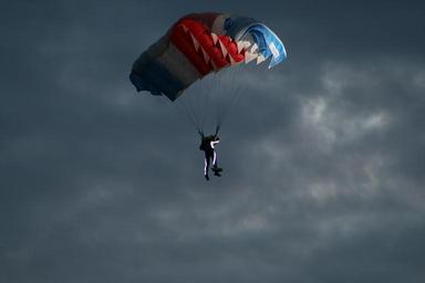 Keywords: parachute parachutist skydiving float sky blue glide sport event sport hobby fly clouds red
