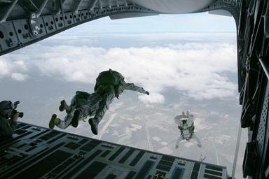 Keywords: parachute skydiving parachuting jumping training military skydivers plane parachutists danger halo high altitude