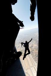 Keywords: parachutist jumping landscape sky clouds navy outside silhouette