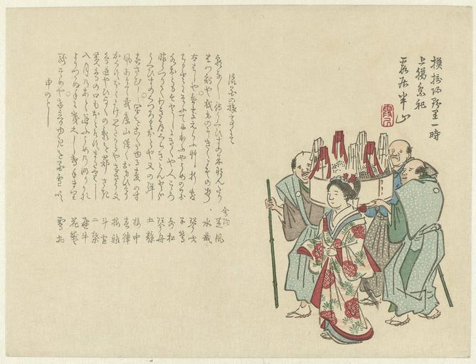 | Keywords: Parade van drie mannen en een vrouw-Rijksmuseum RP-P-2007-463.jpeg accession number RP-P-2007-463 Matsukawa Hanzan credit line GWToolset Rijksmuseum nl Drie mannen met bamboo stokken en grote schaal dragend voorafgegaan door vrouw in kimono Linker deel gedicht Label Line mentioned on object Matsukawa Hanzan 1805 - 1882 1805 - 1882 kleurenhoutsnede; lijnblok met kleurblokken Collection prenten; Japan collectie blad Height mm 192 blad Width mm 253 exhibition history Institution Rijksmuseum paper object history Acquisition 2007 object type prent PD-US PD-old Data and photography rights All data and all images made available through the API are either in the public domain or are subject to a CC0 license https //www rijksmuseum nl/en/api/terms-and-conditions-of-use cc-zero place of creation Japan http //www rijksmuseum nl/collectie/RP-P-2007-463 http //hdl handle net/10934/RM0001 COLLECT 318099 handle Parade van drie mannen en een vrouw Uploaded with GWToolset Rijksmuseum RP-P-2007-463 http //www rijksmuseum nl/media/assets/RP-P-2007-463 Images uploaded by Fæ Images from the Rijksmuseum Japanese 19th-century prints in the Rijksmuseum Amsterdam |