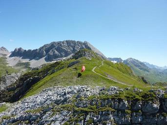 Keywords: paragliding start pull up clipping stage take off paraglider mountains fly sport hobby arlberg rüfikopf aerial view