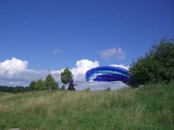 Keywords: paragliding start trial pilot paraglider floating sailing sky blue castle hill