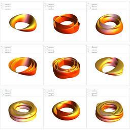 | Keywords: cg 3d mathematica parametricplot3d program プログラム code コード algorithm コード アルゴリズム geometric sculpture geometricsculpture shape geometry sculpture design pattern デザイン パターン graphic グラフィック グラフィクス structure 意匠 構造 symmetry 対称性 たいしょうせい シンメトリー 対称 たいしょう algorithm indoor SetOptions[ParametricPlot3D, MaxRecursion -> 4, PlotStyle -> {Orange, Specularity[White, 10]}, Axes -> None, Mesh -> None, Boxed -> False, ImageSize -> 900]; Manipulate[ ParametricPlot3D[{(3 + Sin[a v]) Sin[u], (3 + Cos[b v]) Cos[u], Cos[c v]}, {u, 0, 2 Pi}, {v, 0, 2 Pi}] , {a, 1, 5, 1}, {b, 1, 5, 1}, {c, 1, 5, 1} ] SetOptions[ParametricPlot3D, MaxRecursion -> 4, PlotStyle -> {Orange, Specularity[White, 10]}, Axes -> None, Mesh -> None, Boxed -> False, ImageSize -> 900]; Manipulate[ ParametricPlot3D[{(3 + Sin[a v]) Sin[u], (3 + Cos[b v]) Cos[u], Cos[c v]}, {u, 0, 2 Pi}, {v, 0, 2 Pi}] , {a, 1, 5, 1}, {b, 1, 5, 1}, {c, 1, 5, 1} ] |