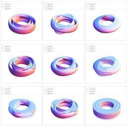 | Keywords: parametricplot3d cg 3d mathematica torus program プログラム code コード algorithm コード アルゴリズム geometric sculpture geometricsculpture shape geometry sculpture design pattern デザイン パターン graphic グラフィック グラフィクス structure 意匠 構造 symmetry 対称性 たいしょうせい シンメトリー 対称 たいしょう algorithm indoor round circle drawing SetOptions[ParametricPlot3D, MaxRecursion -> 4, Axes -> None, Mesh -> None, Boxed -> False, ImageSize -> 900]; Manipulate[ ParametricPlot3D[{(3 + Cos[a v]) Sin[u], (3 + Cos[b v]) Cos[u], Sin[c v]}, {u, 0, 2 Pi}, {v, 0, 2 Pi}] , {a, 1, 5, 1}, {b, 1, 5, 1}, {c, 1, 5, 1} ] SetOptions[ParametricPlot3D, MaxRecursion -> 4, Axes -> None, Mesh -> None, Boxed -> False, ImageSize -> 900]; Manipulate[ ParametricPlot3D[{(3 + Cos[a v]) Sin[u], (3 + Cos[b v]) Cos[u], Sin[c v]}, {u, 0, 2 Pi}, {v, 0, 2 Pi}] , {a, 1, 5, 1}, {b, 1, 5, 1}, {c, 1, 5, 1} ] |