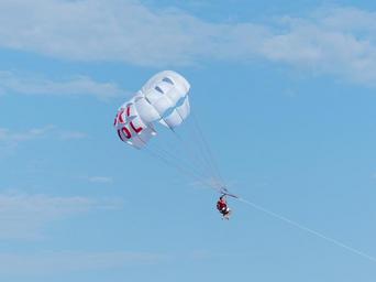 Keywords: parasailing controllable parachuting high parachute fly bird's eye view paragliding hang gliding sky blue paraglider screen sport hobby airy person human water sports