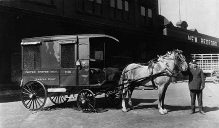 | Keywords: smithsonian institution smithsonianinstitution parcel post parcelpost wagon usps bedford massachusetts new bedford newbedford united states mail unitedstatesmail transportation early 20th century early20thcentury horse carriage united states unitedstates mail national postal museum nationalpostalmuseum mail across the commons mailacrossthecommons new bedford, massachusetts newbedfordmassachusetts 1913 blackandwhite monochrome black and white Description: A postal employee posed with this brand new parcel post wagon in New Bedford, Massachusetts. The Parcel Post Service began on January 1, 1913. Creator/Photographer: Unidentified photographer Medium: Black and white photographic print Culture: American Geography: USA Date: 1913 Collection: U.S. Mail Wagons Repository: National Postal Museum Accession number: A.2008-33 Persistent URL: arago.si.edu/index.asp?con=2&cmd=1&id=194385 View more collections from the Smithsonian Institution. Description: A postal employee posed with this brand new parcel post wagon in New Bedford, Massachusetts. The Parcel Post Service began on January 1, 1913. Creator/Photographer: Unidentified photographer Medium: Black and white photographic print Culture: American Geography: USA Date: 1913 Collection: U.S. Mail Wagons Repository: National Postal Museum Accession number: A.2008-33 Persistent URL: arago.si.edu/index.asp?con=2&cmd=1&id=194385 View more collections from the Smithsonian Institution. |