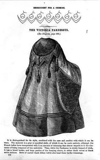 | Keywords: Pardessus-Godeys-Ladies-Book-Spring,1859.jpg Godey's Ladies Book S 104 Das viktorianische Pardessus Siehe auch das Schnittmuster dazu Februar 1859 Embroidery for a chemise The Victoria Pardessus It is distinguished fot its style combined with the ease and comfort with which it can be worn The material is a gray or speckled cloth of which it can be made entirely also the French ladies have incorporated with it an amount of trimmings that almost imparts to it the character of being composed of two materials Thus while the pardessus chiefly framed of cloth it has a broad border and large portion of hanging sleeve in either black velvet or black moire antique Rows of narrow black ribbon velvet also head this border trimmings http //thedreamstress com/2011/11/more-terminology-what-is-a-pardessus http //thedreamstress com/2011/11/more-terminology-what-is-a-pardessus 1859 Kürschner <span class signature-talk >talk</span> 19 39 10 May 2014 UTC PD-old <gallery>Pardessus-Godeys-Ladies-Book-Spring 1859 the pattern jpg Das Schnittmuster </gallery> Pardessus Fashion in 1859 Godey's Lady's Book |