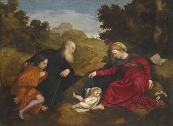 | Keywords: Paris Bordone - Madonna con Bambino e Sant'Antonio e un giovane donatore.jpg Artwork Creator Paris Bordone oil panel langSwitch transferred to canvas auf Leinwand übertragen trasferito su tela cm 61 6 82 9 accession number object history Sir George Warrender 4th Bt by 1831;<br/>His sale London Christie's 3 June 1837 lot 19 bought in ;<br/>By descent to Sir Victor Alexander George Anthony Warrender 8th Bt 1st Baron Bruntisfield 1899-1993 ;<br/>His sale London Christie's 26 November 1943 lot 2 where bought by Wengraf;<br/>Acquired by Sir Thomas Barlow G B E in 1946;<br/>Thence by descent credit line exhibition history London British Institution 1831 no 152;<br/>Birmingham City of Birmingham Museum and Art Gallery Italian Art from the 13th Century to the 17th Century 1955 no 19;<br/>Manchester City of Manchester Art Galleries Art Treasures Centenary Exhibition 1957 no 56 lent by Sir Thomas Barlow ;<br/>London Royal Academy 1960 no 80;<br/>London Royal Academy Winter Exhibition Italain Art and Britain 1969 no 32 Paris bordonus tarivisinus f lower right signature http //www sothebys com/de/auctions/ecatalogue/2011/old-master-and-british-paintings-day-sale/lot 109 html Sotheby's London 08 Dezember 2011 lot 109 PD-old-100 DEFAULTSORT Bordone Paris; Madonna and child with St Antony; Sotheby's 2011 Paris Bordone 16th-century paintings of Madonna and Child from Italy Paintings of Saint Anthony the Great Images from Sotheby's Paintings of people sitting on the ground outdoors |