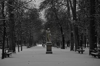 Keywords: paris france statue monument sculpture trees park black and white benches city cities winter snow outside
