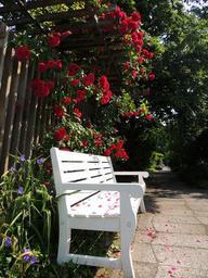 Keywords: park bench park bench bank nature out landscape rest red trees roses away