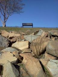 Keywords: park bench rocks stones outdoors blue sky