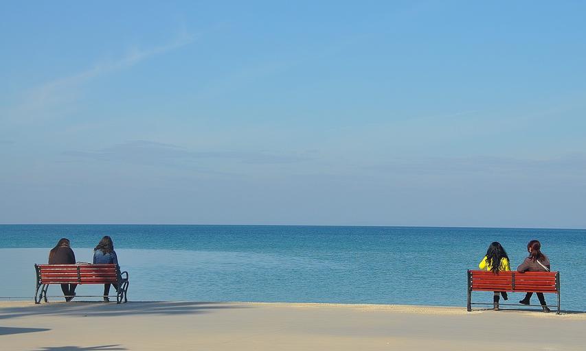 Keywords: park bench seat sitting couple beach sea sky ocean water wood wave horizon blue wooden bench
