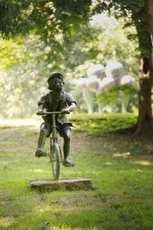 Keywords: park boy bike bicycle bronze metal sculpture green grass bangkok thailand tree